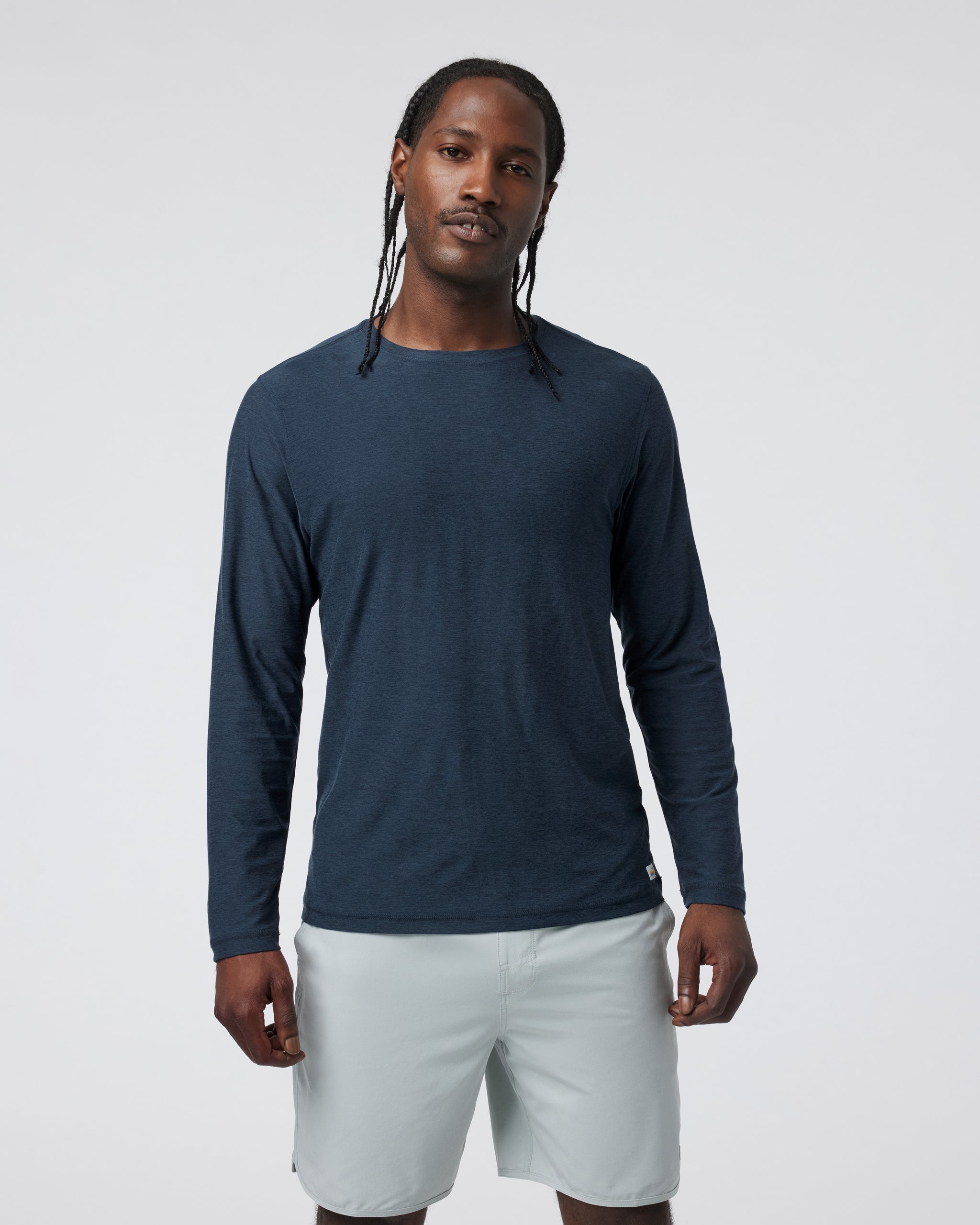 With next-level comfort, the Long-Sleeve Strato Tech Tee features Vuori's softest, moisture wicking performance knit. Shop this navy-blue long sleeve top.