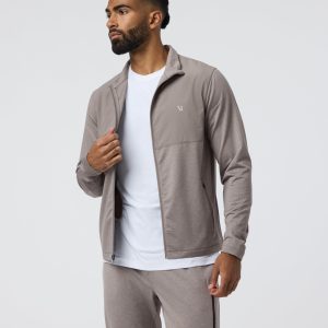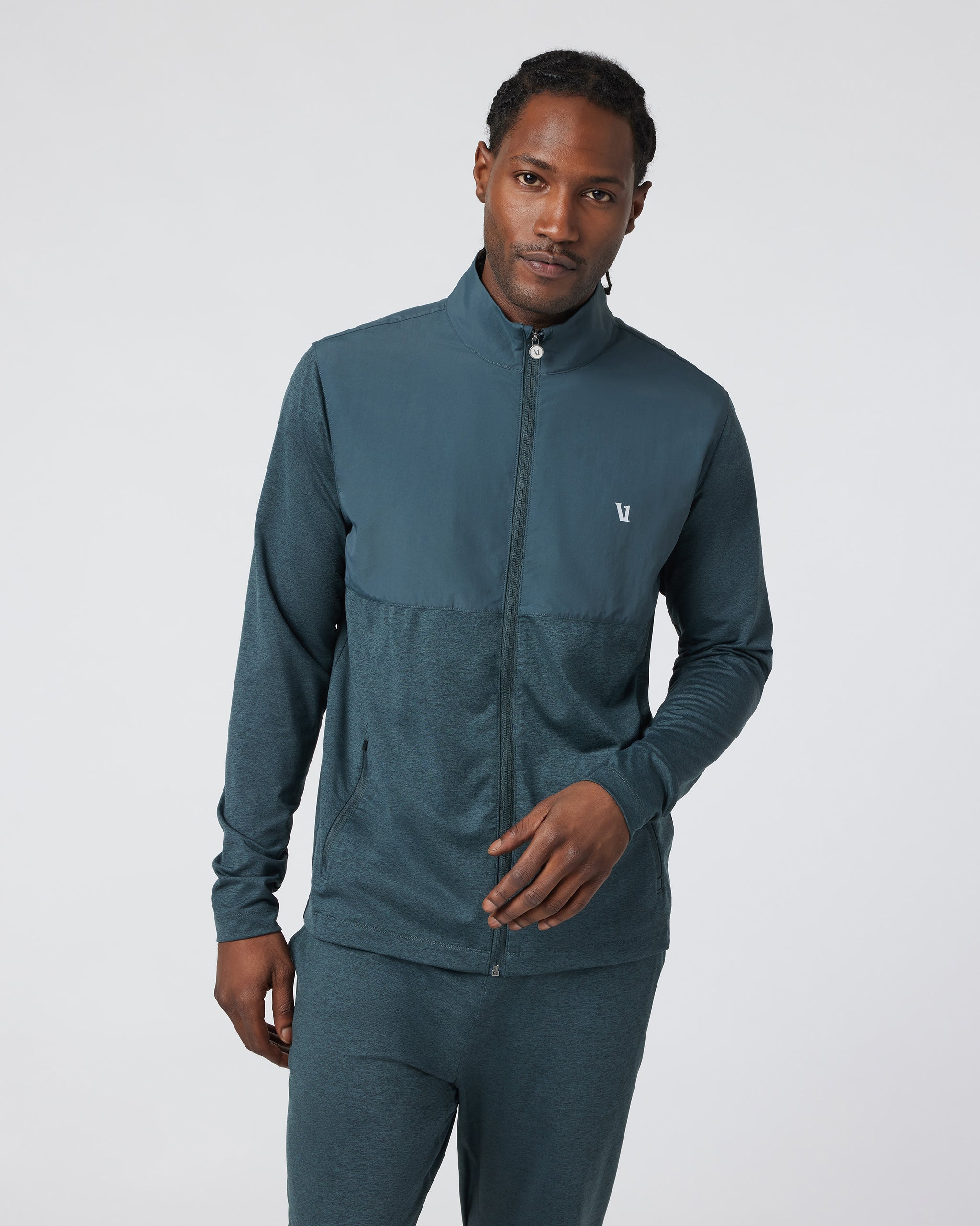 The Sunday Element Track Jacket in Kale Heather is an easy-to style men's athletic jacket made from a mostly recycle stretch knit. Shop from Vuori.