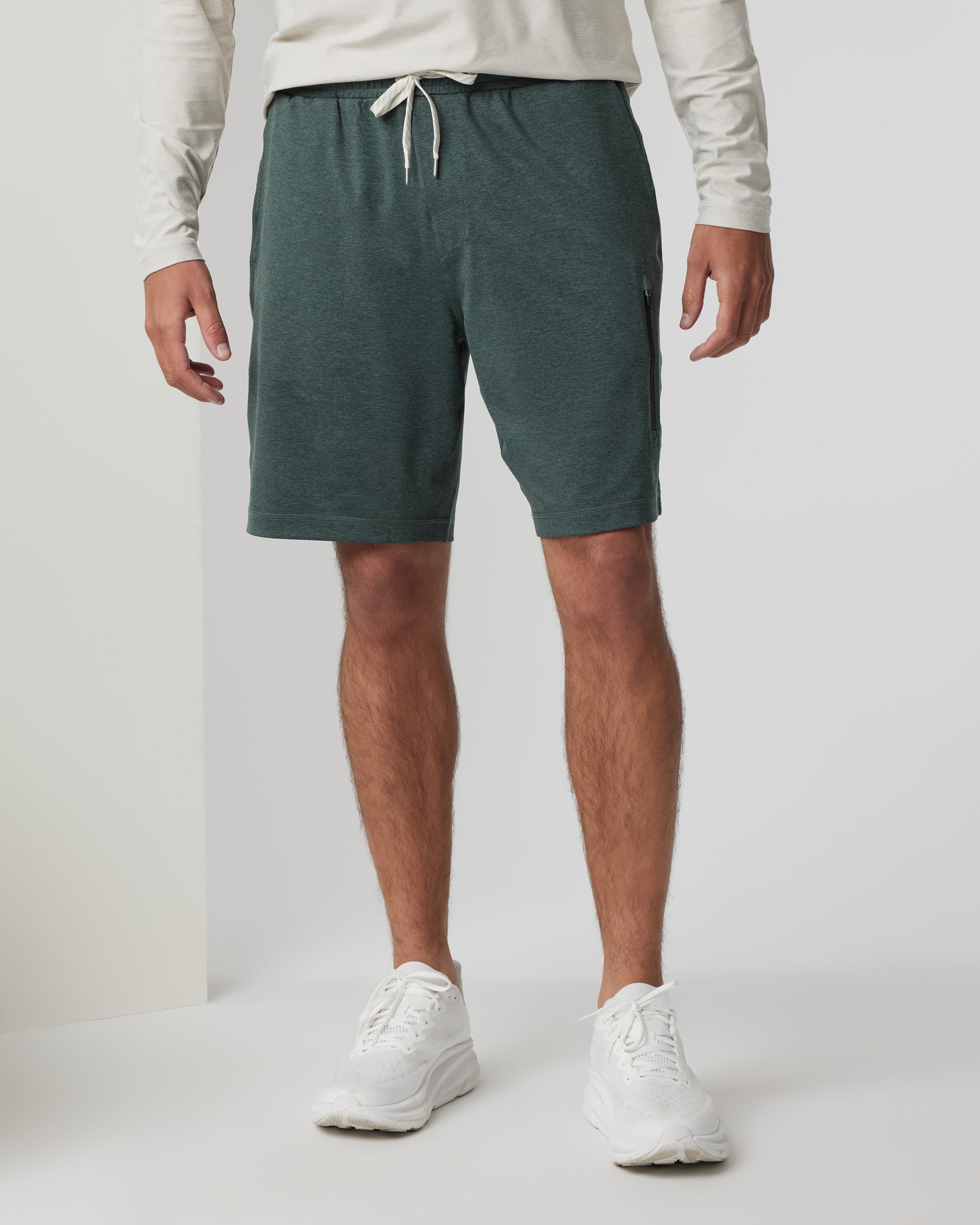 The Sunday Performance Short 8.5" features a longer inseam for added coverage and comfort. Shop these men's Aspen Heather athletic shorts from Vuori.
